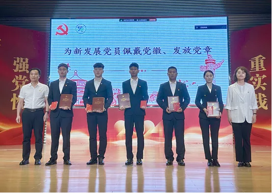 学院党委书记杨军📋、学院党委委员、副院长潘政彬为新发展党员佩戴党徽🖕🏻、发放党章。